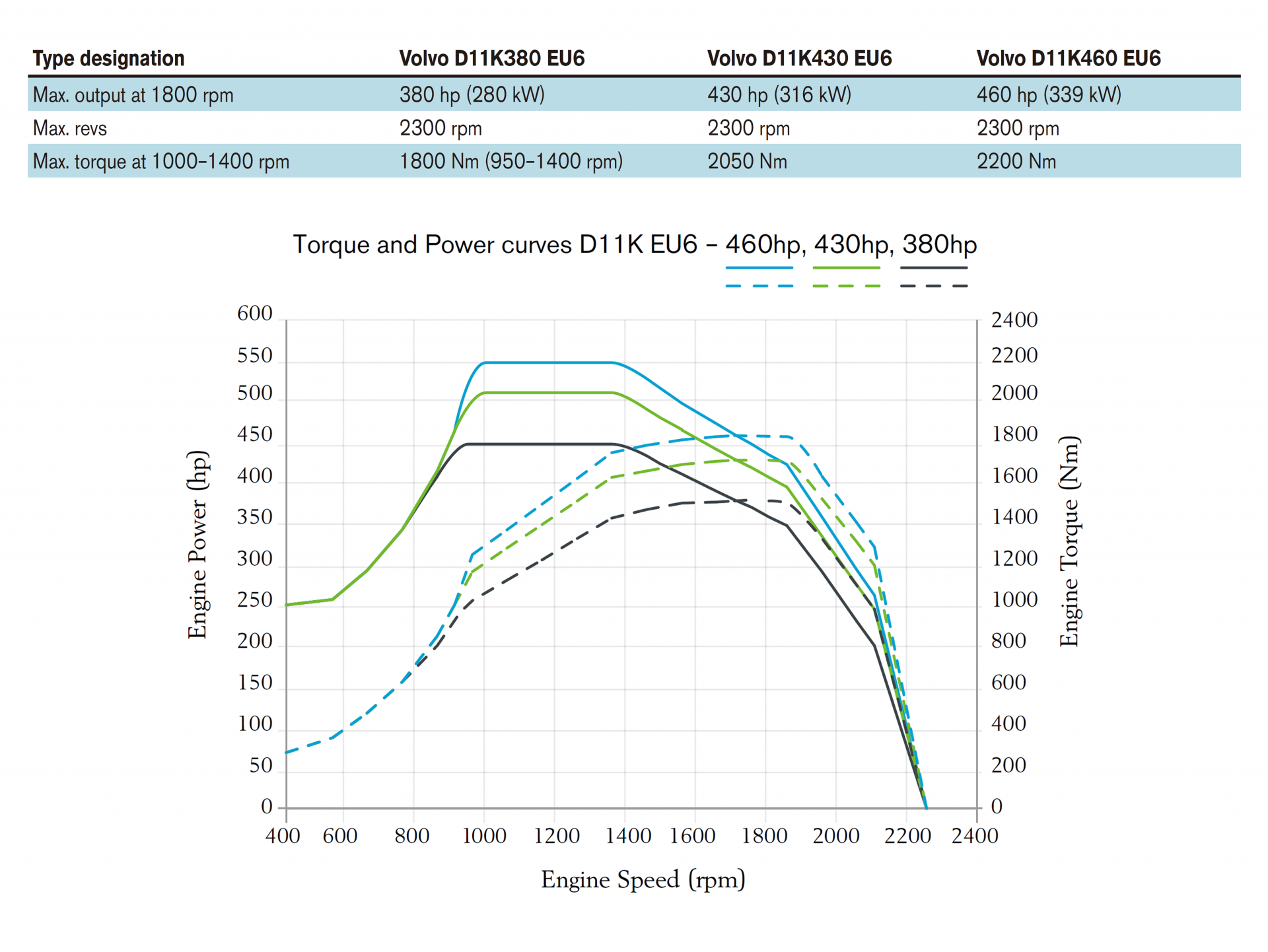 cylinder. It is available with power outputs of 380, 430, and 460 hp. The engine meets EU exhaust emission requirements