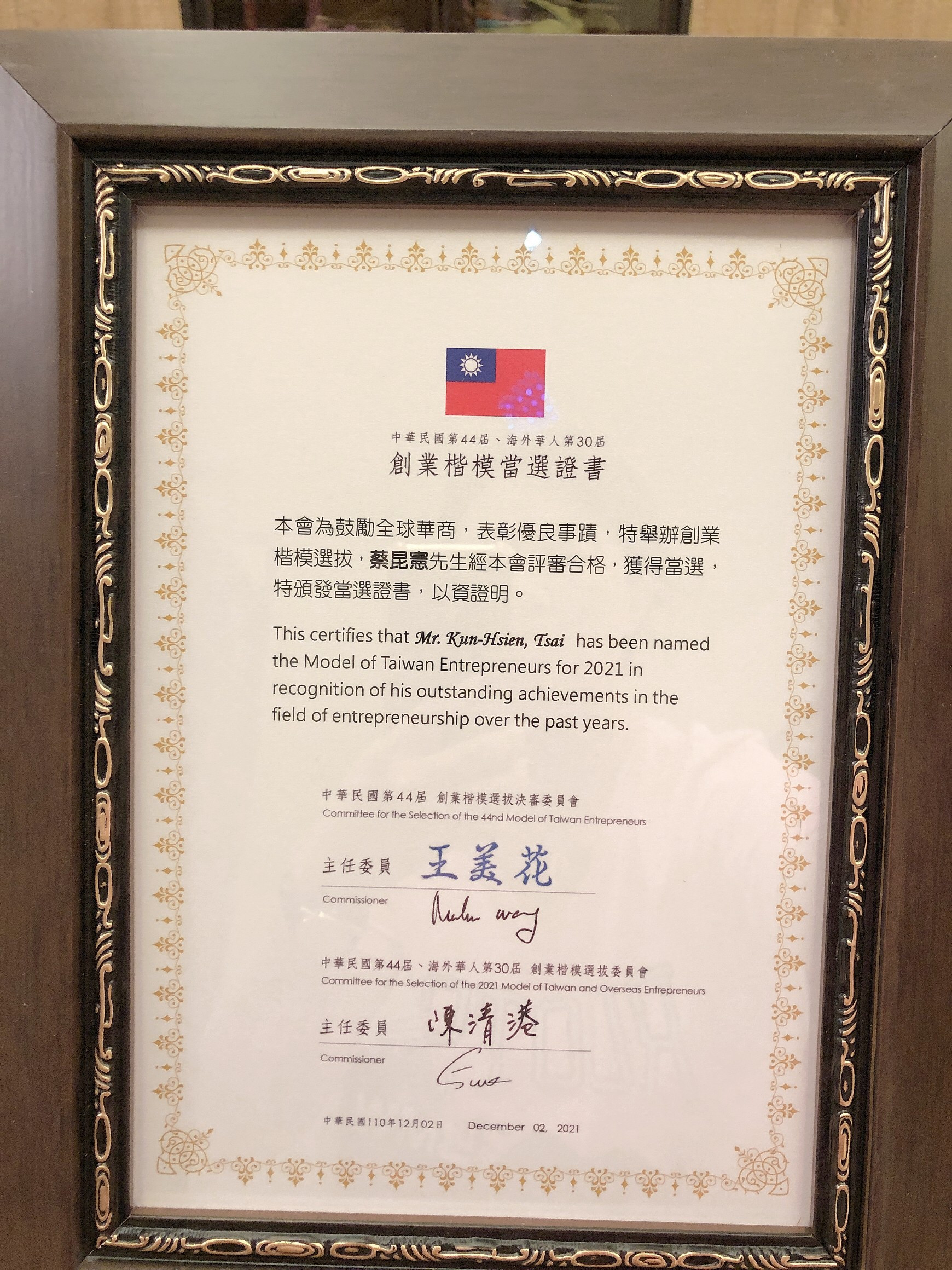 General Manager Kun-Hsien Tsai Won the Model Award for Entrepreneurship